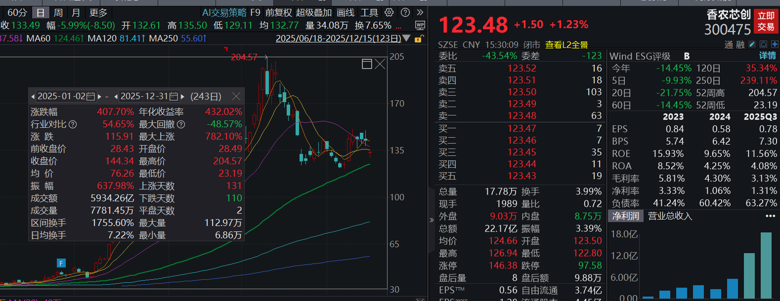 截至4月7日收盘,香农芯创股价为123.48元/股,总市值576亿元。Wind数据显示,2025年全年,香农芯创股价累计上涨407%。