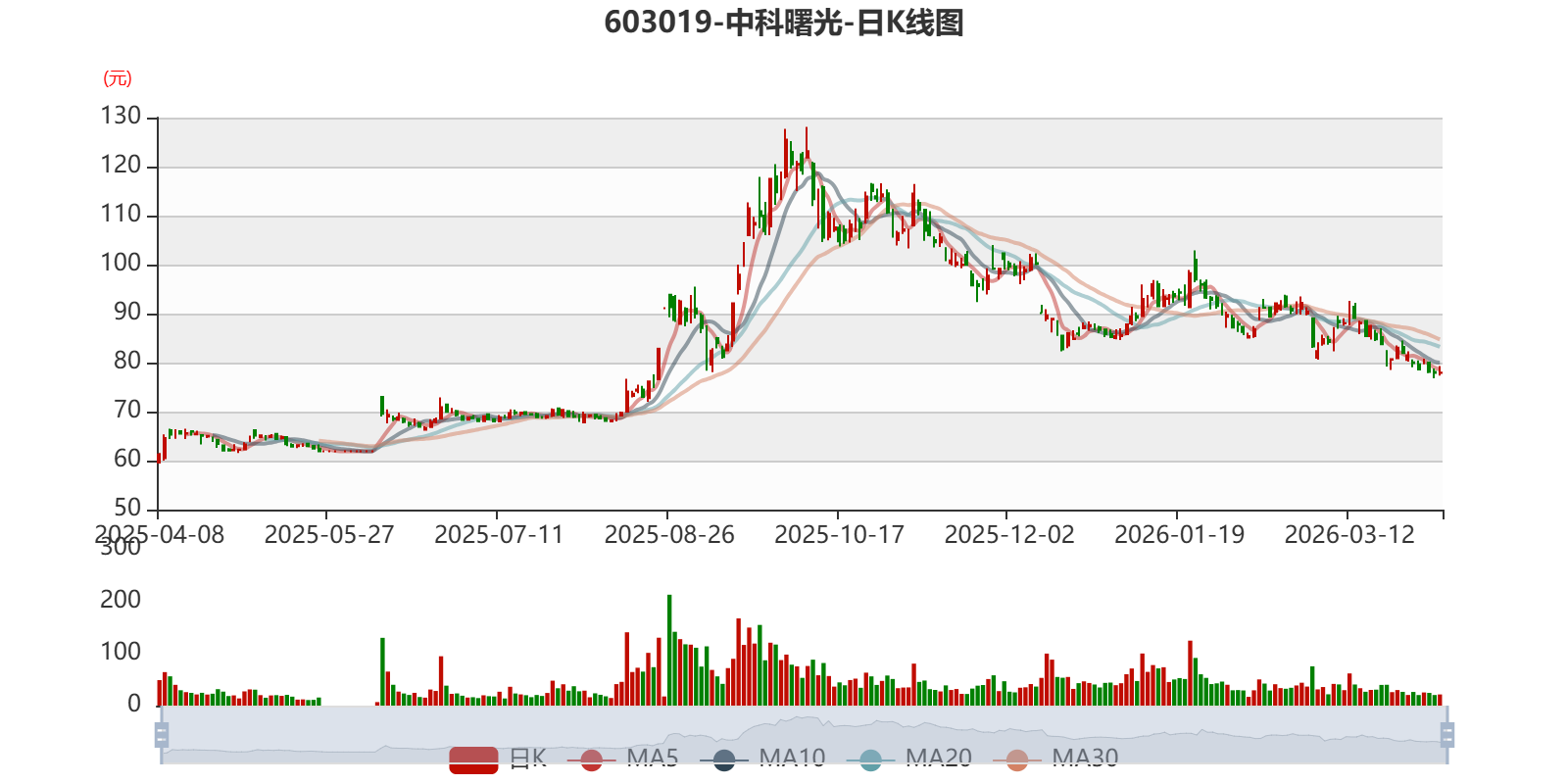 中证智能财讯中科曙光(603019)4月7日晚间披露2026年一季度业绩快报,公司实现营业收入30.72亿元,同比增长18.8%;归母净利润2.25亿元,同比增长20.88%;扣非净利润1.69亿元,同比增长57.77%;基本每股收益0.155元,加权平均净资产收益率为1.01%。以最新收盘价计算,市净率(LF)约5.17倍,市销率(TTM)约7.62倍。
