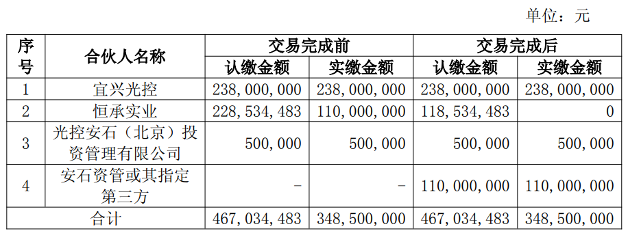 4月7日,光大嘉宝(600622)发布公告,公司控股子公司安石资管拟以1.3亿元的交易对价受让恒承实业持有的1.1亿元珠海安石宜鸿投资中心(有限合伙)已实缴份额。本次交易完成前后基金结构如下: