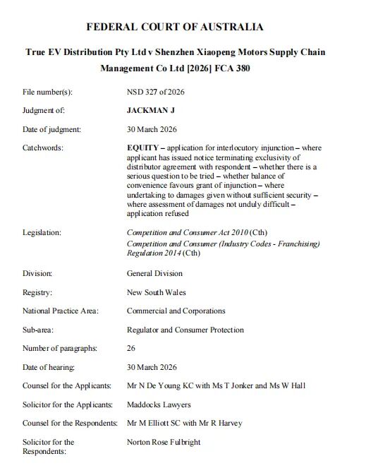 针对此次纠纷,TrueEV称小鹏“过河拆桥”,试图绕开独家代理、自建直营网络,同时指控小鹏干涉其融资、切断支持,导致其资金链断裂。其曾向法院申请禁令,但该申请被澳大利亚当地法院于今年4月1日予以驳回。