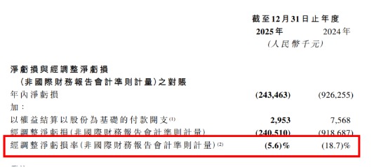 2024年公司全年净亏损9.26亿元,2025年经调整净亏损从2024年的9.19亿元收窄至2.41亿元,亏损同比减少73.8%,经调整净亏损率从2024年的-18.7%收窄至-5.6%。