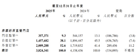值得关注的是,外卖订单成为2025年直营门店唯一实现增长的部分,该部分收入同比增长11.2%,收入占比首次超过50%,达到52.6%,其中来自第三方平台的订单收入占比49.1%,而门店点单和自提订单收入均同比下降。