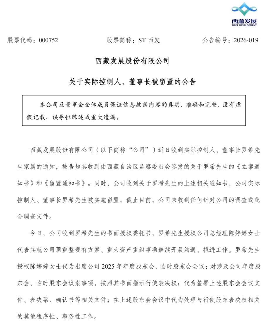 4月7日,西藏发展股份有限公司(股票代码:000752.SZ,简称“ST西发”)公告称,公司近日收到通知,实际控制人、董事长罗希被西藏自治区监察委员会实施留置。截至目前,公司未收到针对公司的调查文件。罗希已授权总经理陈婷婷代表其推进预重整及重大资产重组事项,并代为出席股东会行使表决权;副董事长廖川代为履行董事长职责。目前公司控制权未发生变化,其他董监高正常履职,日常经营正常,该事项暂未对董事会运作及公司经营产生重大影响。公司处于预重整阶段,重大资产重组工作正在进行中,但能否进入重整程序及重组能否通过尚存在不确定性。