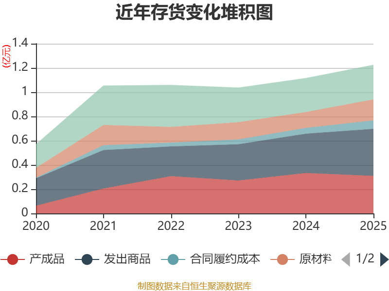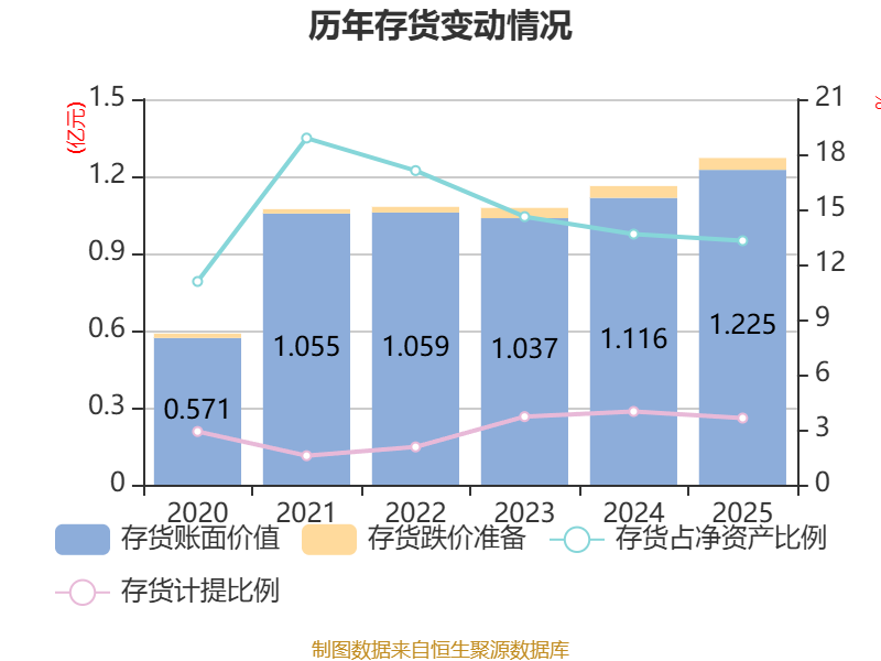 从存货变动来看,截至2025年末,公司存货账面价值为1.23亿元,占净资产的13.29%,较上年末增加1087.99万元。其中,存货跌价准备为461.18万元,计提比例为3.63%。
