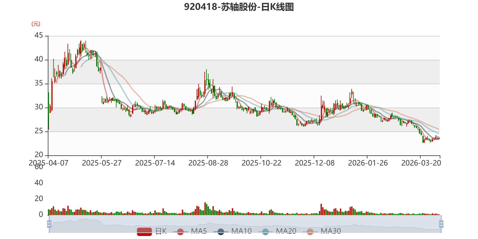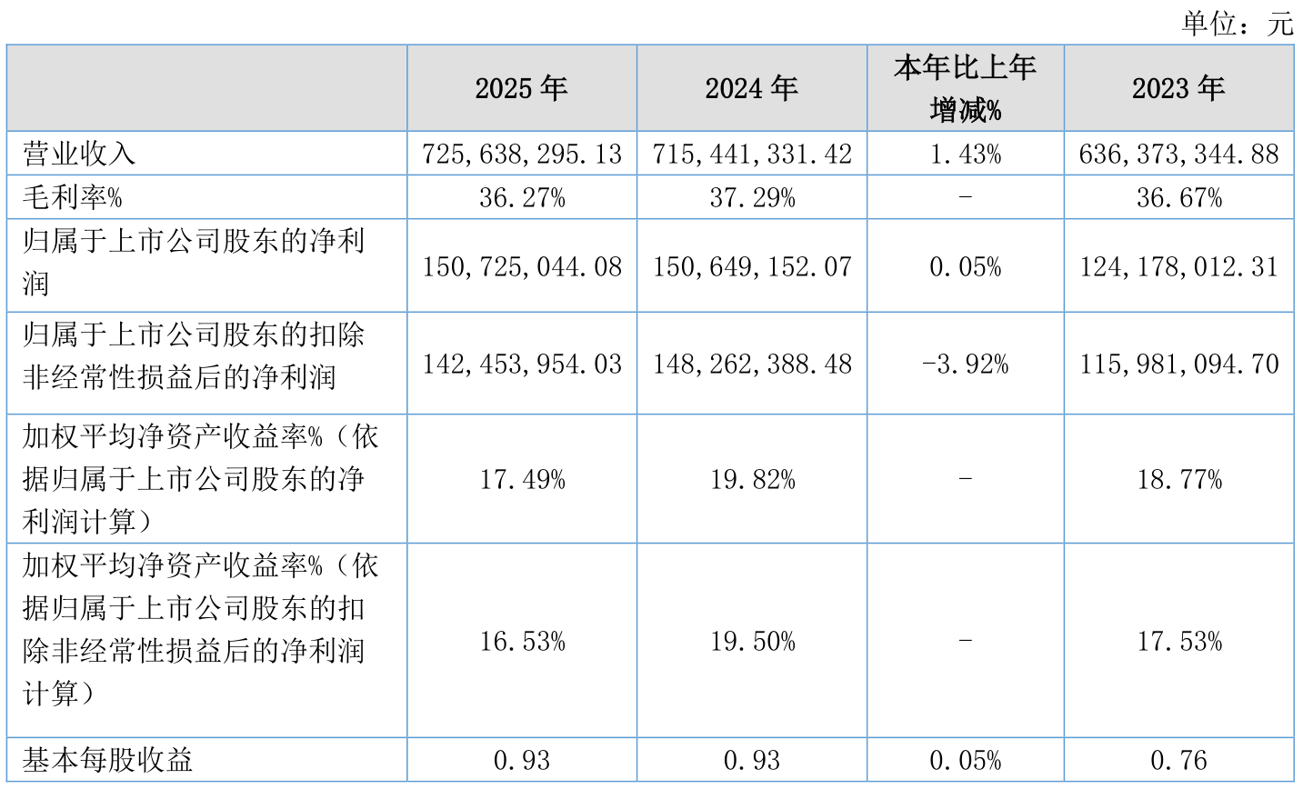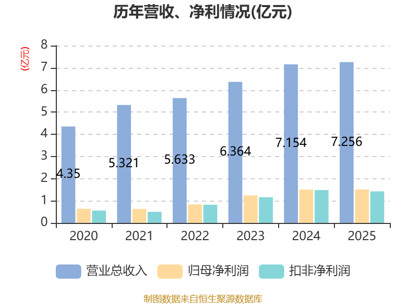 中证智能财讯苏轴股份(920418)4月7日披露2025年年度报告。2025年,公司实现营业总收入7.26亿元,同比增长1.43%;归母净利润1.51亿元,同比增长0.05%;扣非净利润1.42亿元,同比下降3.92%;经营活动产生的现金流量净额为2.23亿元,同比增长47.43%;报告期内,苏轴股份基本每股收益为0.93元,加权平均净资产收益率为17.49%。公司2025年度分配预案为:拟向全体股东每10股派现3.5元(含税)。