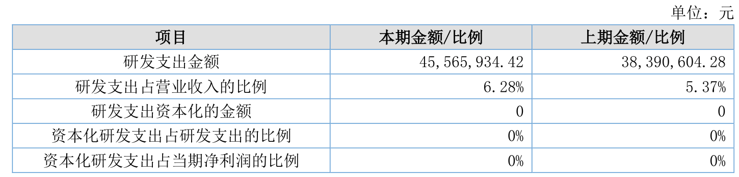 2025年全年,公司研发投入金额为4556.59万元,同比增长18.69%;研发投入占营业收入比例为6.28%,相比上年同期上升0.91个百分点。此外,公司全年研发投入资本化率为0%。