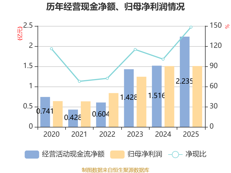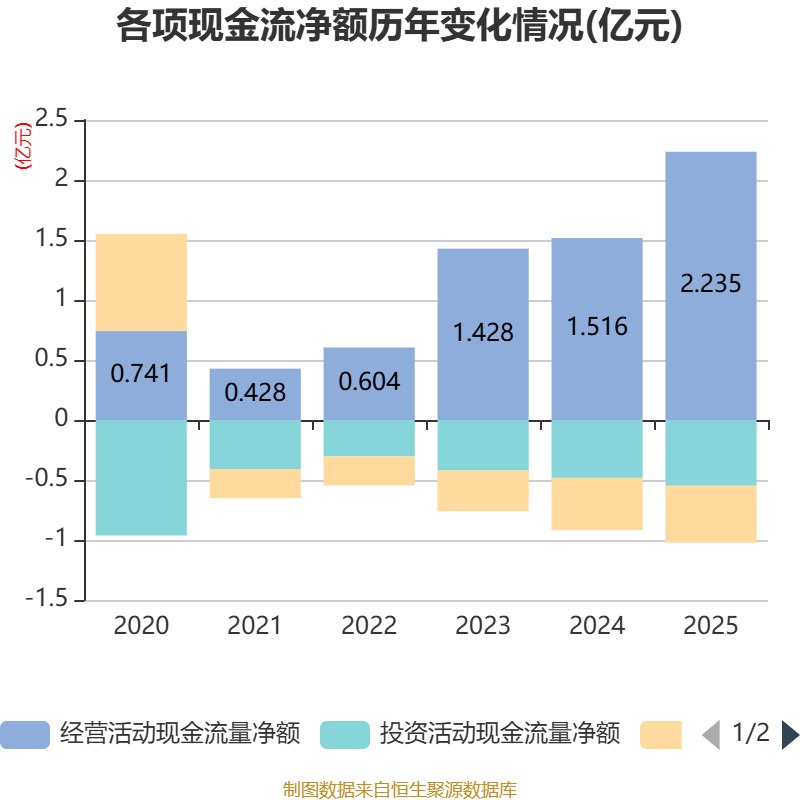 截至2025年,公司经营活动现金流净额为2.23亿元,同比增长47.43%;筹资活动现金流净额-4739.28万元,同比减少386.88万元;投资活动现金流净额-5484.55万元,上年同期为-4818.92万元。