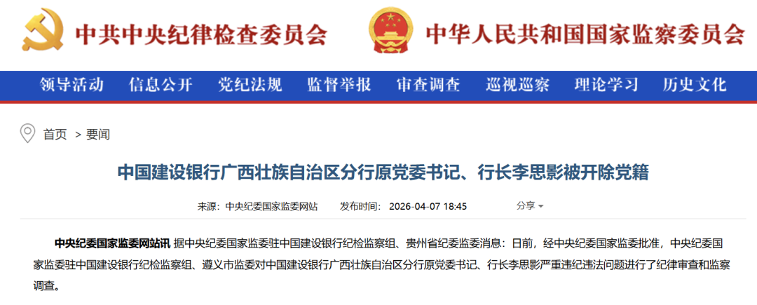 4月7日,中央纪委国家监委官网通报:中国建设银行广西壮族自治区分行原党委书记、行长李思影被开除党籍。