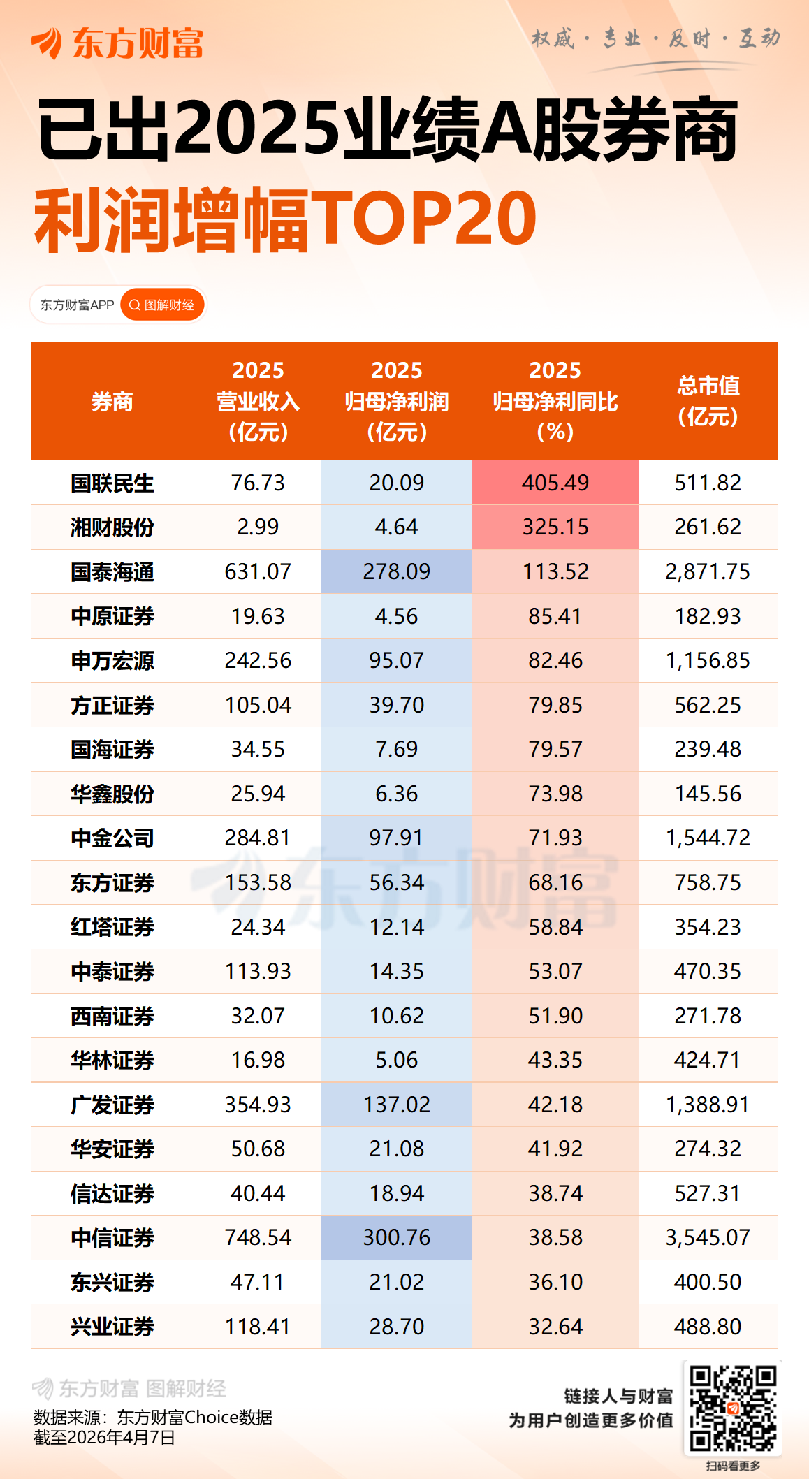 2025年,证券行业实现营业收入5411.71亿元、净利润2194.39亿元,同比分别增长19.95%、31.20%。128家公司实现盈利,盈利面达85.3%,行业平均净资产收益率(ROE)为6.79%,同比提升1.29个百分点。