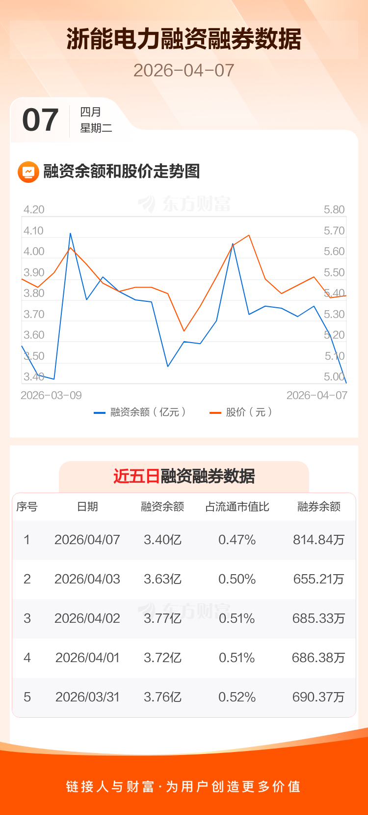 交易所最新数据显示,浙能电力于2026年4月7日获融资买入798.88万元,融资偿还3071.38万元,当日融资净偿还2272.5万元。目前,该股融资余额3.40亿,占流通市值比例为0.47%。