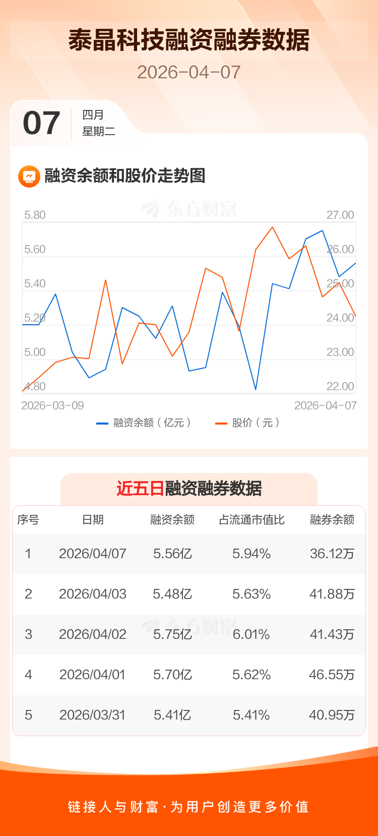 交易所最新数据显示,泰晶科技于2026年4月7日获融资买入1.22亿元,融资偿还1.14亿元,当日融资净买入820.88万元。目前,该股融资余额5.56亿,占流通市值比例为5.94%。