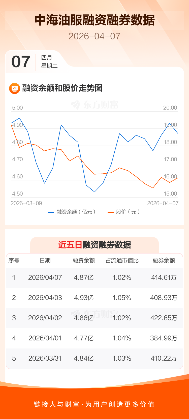 交易所最新数据显示,中海油服于2026年4月7日获融资买入4148.92万元,融资偿还4817.59万元,当日融资净偿还668.67万元。目前,该股融资余额4.87亿,占流通市值比例为1.02%。