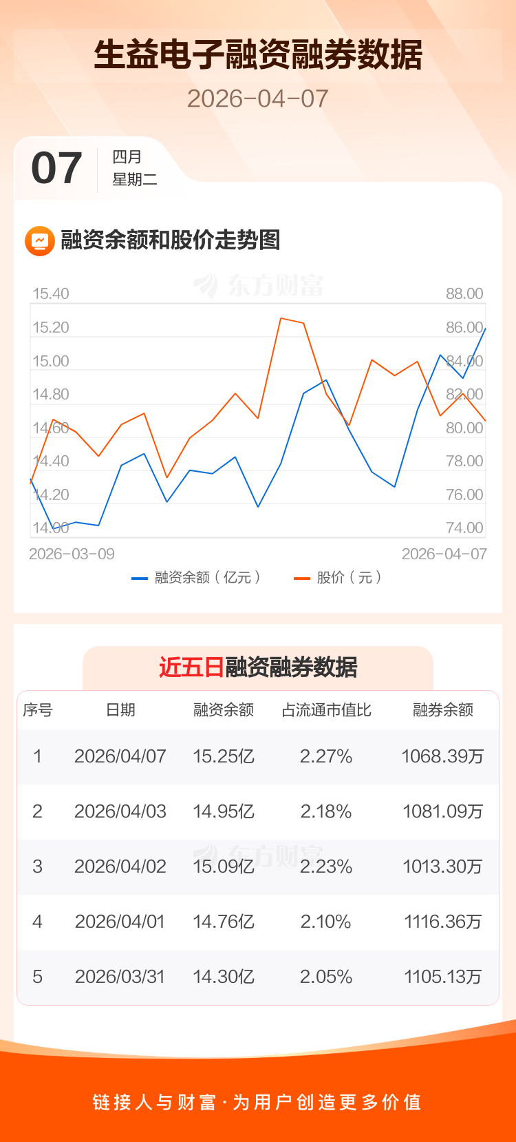交易所最新数据显示,生益电子于2026年4月7日获融资买入1.31亿元,融资偿还1.01亿元,当日融资净买入2984.52万元。目前,该股融资余额15.25亿,占流通市值比例为2.27%。