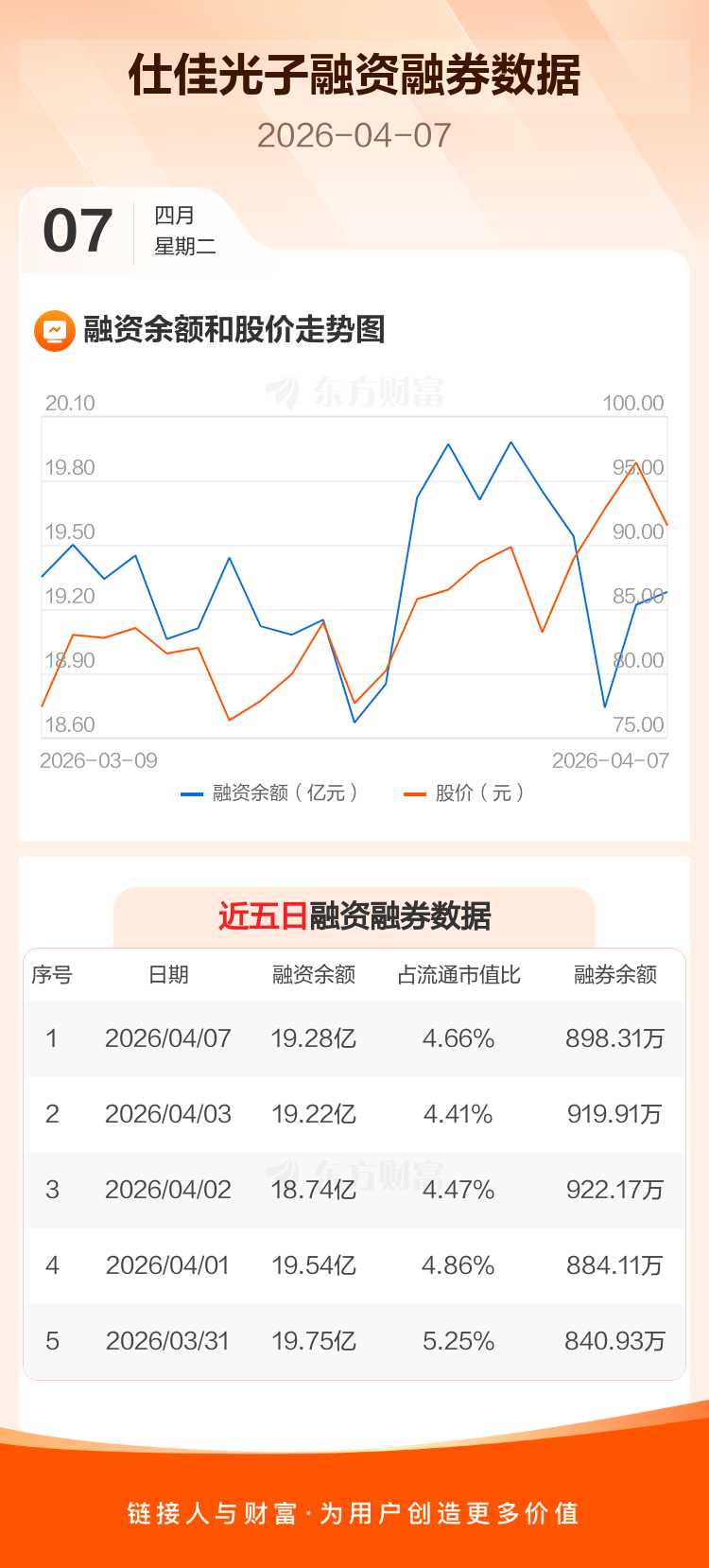 交易所最新数据显示,仕佳光子于2026年4月7日获融资买入4.55亿元,融资偿还4.50亿元,当日融资净买入518.66万元。目前,该股融资余额19.28亿,占流通市值比例为4.66%。