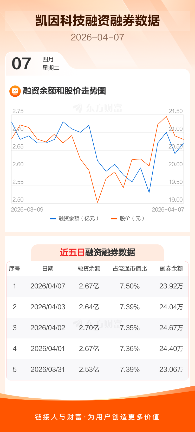 交易所最新数据显示,凯因科技于2026年4月7日获融资买入1196.26万元,融资偿还939.09万元,当日融资净买入257.17万元。目前,该股融资余额2.67亿,占流通市值比例为7.50%。