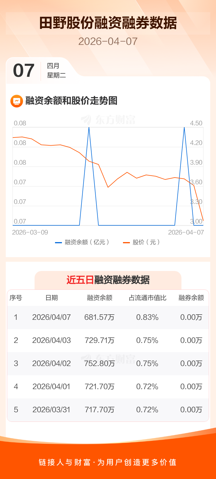 交易所最新数据显示,田野股份于2026年4月7日获融资买入68.26万元,融资偿还116.40万元,当日融资净偿还48.15万元。目前,该股融资余额681.57万,占流通市值比例为0.83%。