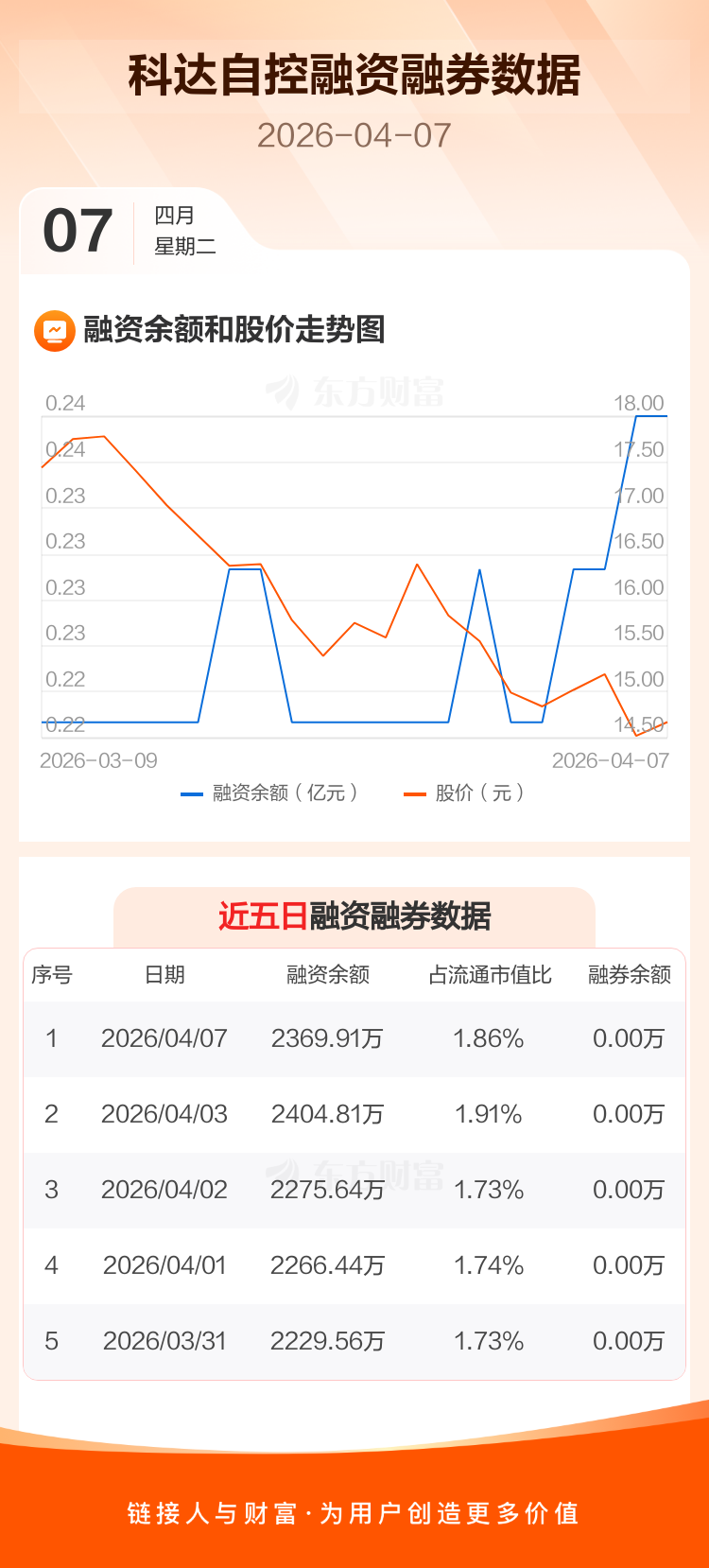 交易所最新数据显示,科达自控于2026年4月7日获融资买入3.62万元,融资偿还38.52万元,当日融资净偿还34.9万元。目前,该股融资余额2369.91万,占流通市值比例为1.86%。