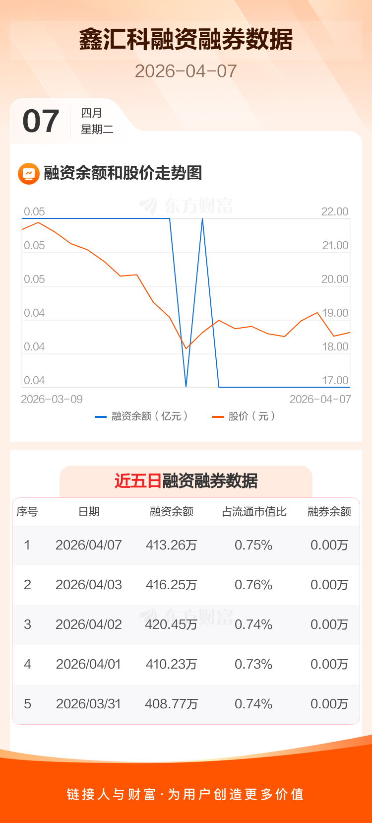交易所最新数据显示,鑫汇科于2026年4月7日获融资买入22.57万元,融资偿还25.56万元,当日融资净偿还2.99万元。目前,该股融资余额413.26万,占流通市值比例为0.75%。