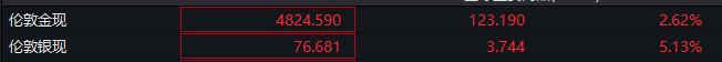 国际金银价格直线拉升,伦敦金现快速突破4800美元整数关口,截至发稿,伦敦金现日内涨2.62%,伦敦银现日内涨5.13%。