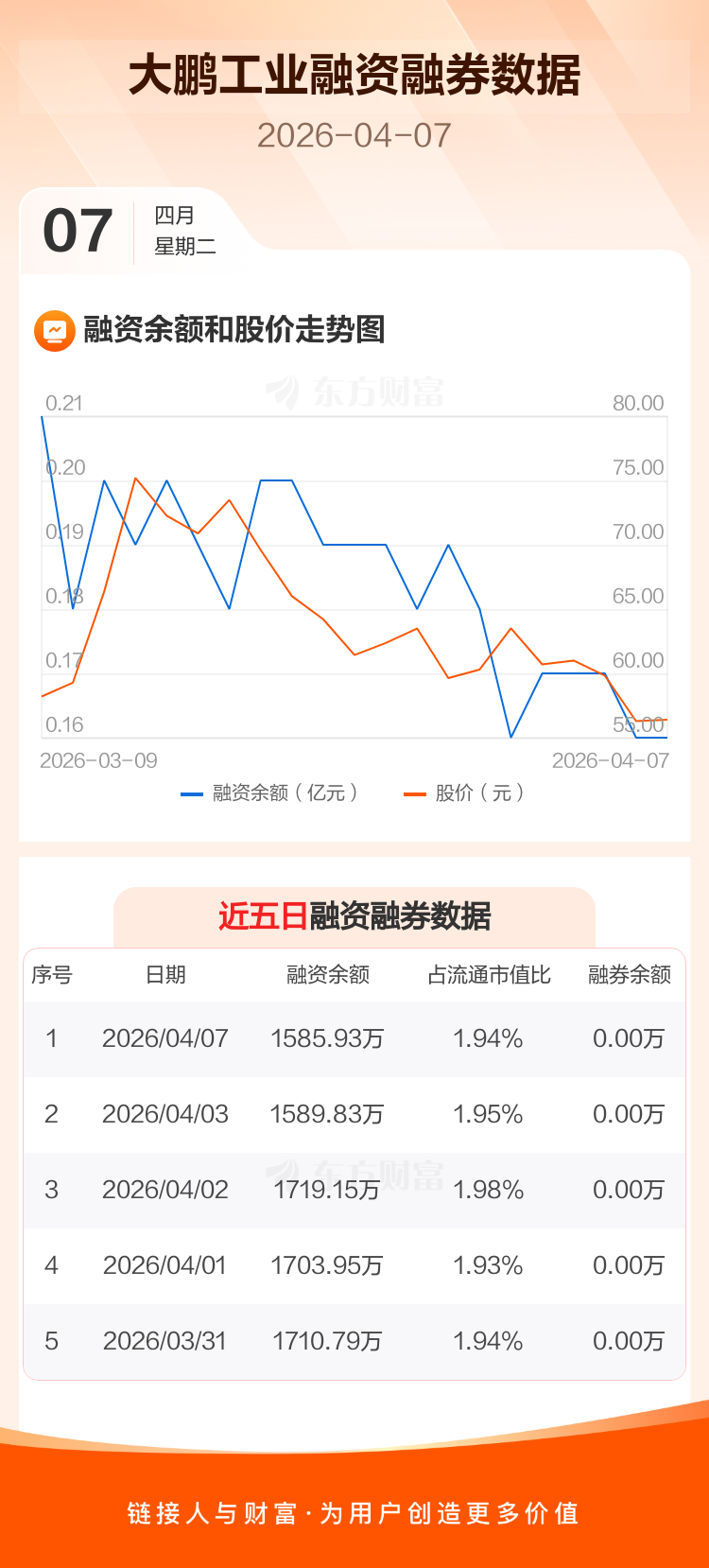 交易所最新数据显示,大鹏工业于2026年4月7日获融资买入57.56万元,融资偿还61.47万元,当日融资净偿还3.9万元。目前,该股融资余额1585.93万,占流通市值比例为1.94%。