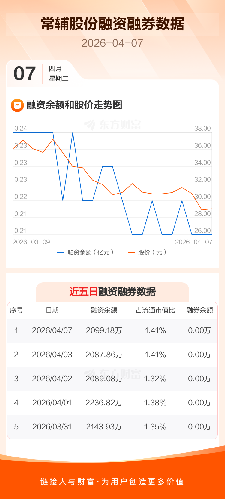交易所最新数据显示,常辅股份于2026年4月7日获融资买入171.70万元,融资偿还160.38万元,当日融资净买入11.32万元。目前,该股融资余额2099.18万,占流通市值比例为1.41%。