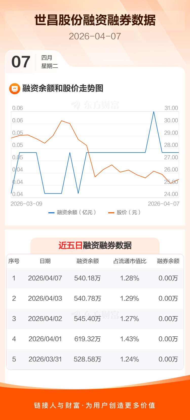 交易所最新数据显示,世昌股份于2026年4月7日获融资买入0元,融资偿还6000元,当日融资净偿还6000元。目前,该股融资余额540.18万,占流通市值比例为1.28%。