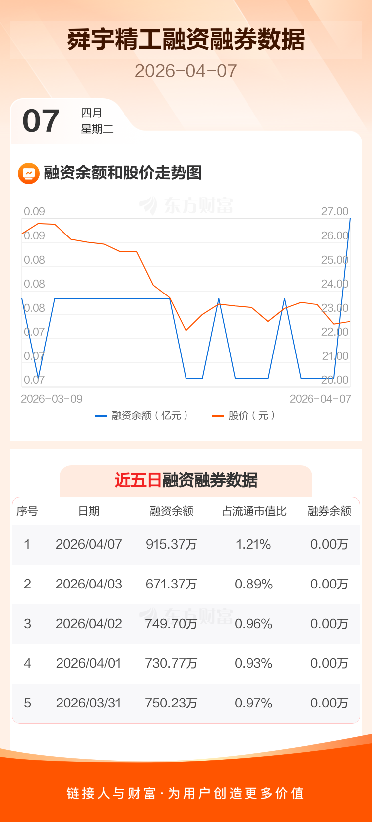 交易所最新数据显示,舜宇精工于2026年4月7日获融资买入254.71万元,融资偿还10.71万元,当日融资净买入244万元。目前,该股融资余额915.37万,占流通市值比例为1.21%。