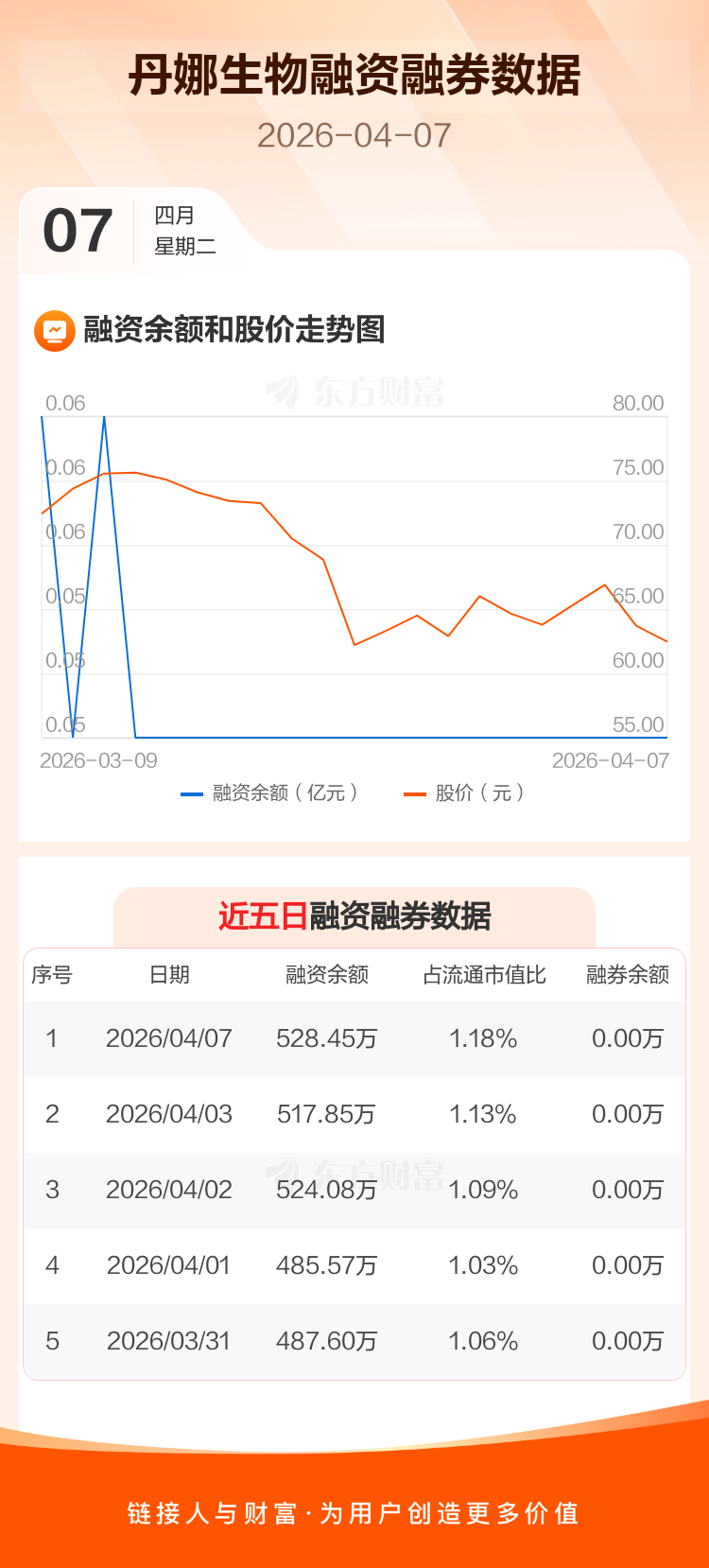 交易所最新数据显示,丹娜生物于2026年4月7日获融资买入15.72万元,融资偿还5.12万元,当日融资净买入10.6万元。目前,该股融资余额528.45万,占流通市值比例为1.18%。