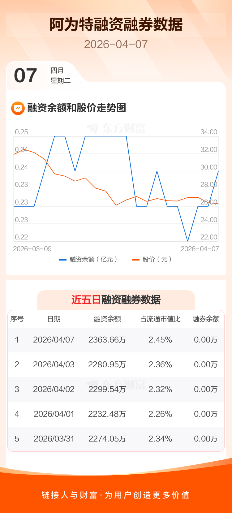 交易所最新数据显示,阿为特于2026年4月7日获融资买入120.58万元,融资偿还37.87万元,当日融资净买入82.71万元。目前,该股融资余额2363.66万,占流通市值比例为2.45%。