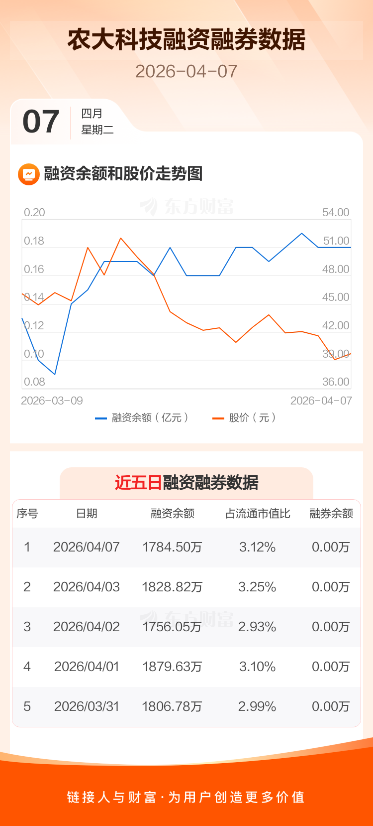 交易所最新数据显示,农大科技于2026年4月7日获融资买入226.18万元,融资偿还270.50万元,当日融资净偿还44.32万元。目前,该股融资余额1784.50万,占流通市值比例为3.12%。