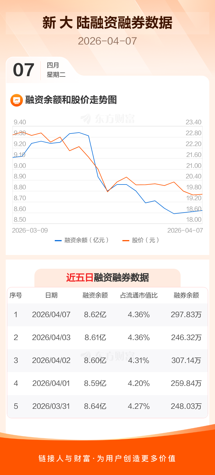 交易所最新数据显示,新 大 陆于2026年4月7日获融资买入1410.60万元,融资偿还1326.05万元,当日融资净买入84.54万元。目前,该股融资余额8.62亿,占流通市值比例为4.36%。