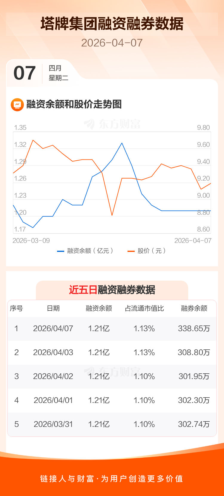 交易所最新数据显示,塔牌集团于2026年4月7日获融资买入340.49万元,融资偿还254.54万元,当日融资净买入85.95万元。目前,该股融资余额1.21亿,占流通市值比例为1.13%。