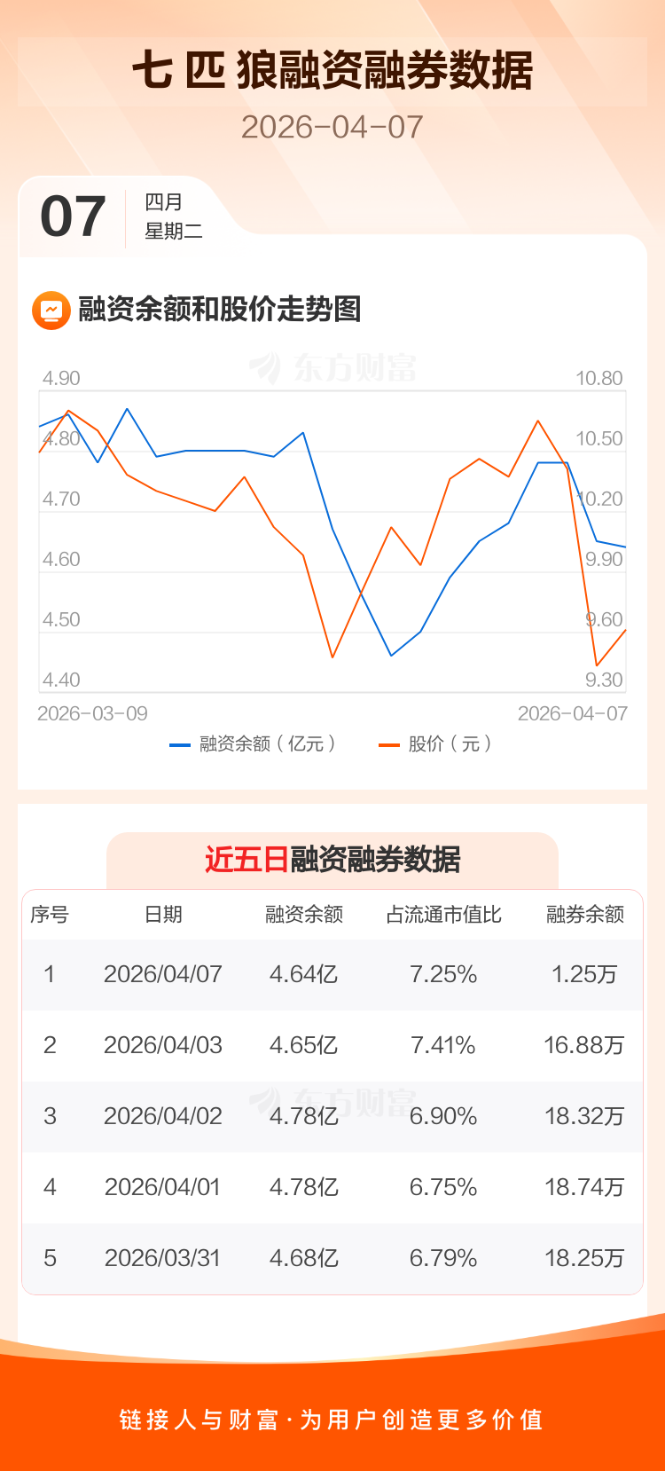 交易所最新数据显示,七 匹 狼于2026年4月7日获融资买入2465.65万元,融资偿还2594.03万元,当日融资净偿还128.37万元。目前,该股融资余额4.64亿,占流通市值比例为7.25%。