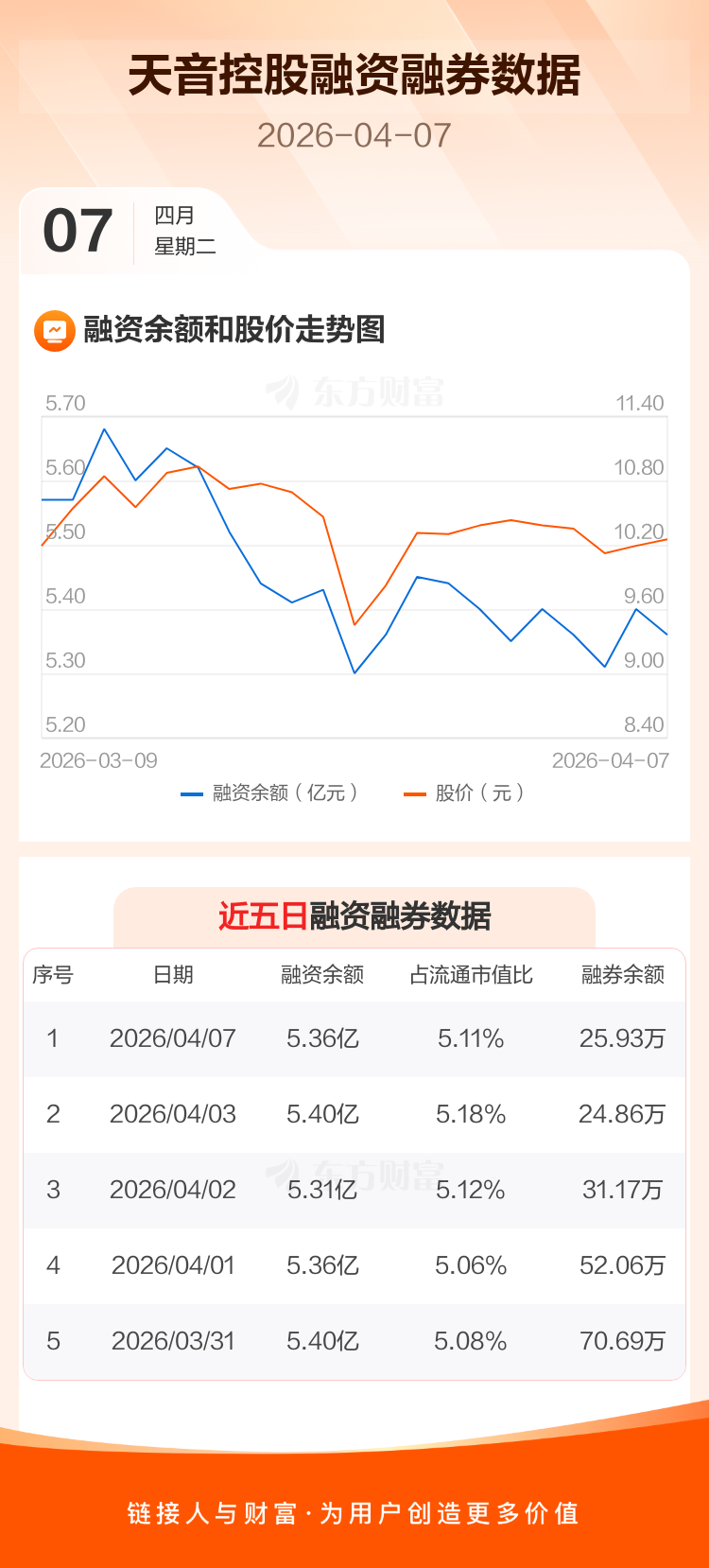 交易所最新数据显示,天音控股于2026年4月7日获融资买入1215.99万元,融资偿还1580.53万元,当日融资净偿还364.53万元。目前,该股融资余额5.36亿,占流通市值比例为5.11%。