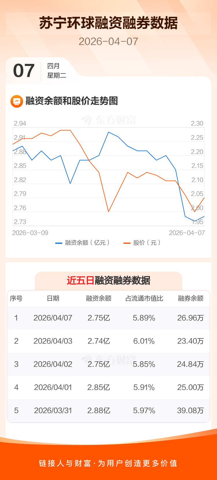 交易所最新数据显示,苏宁环球于2026年4月7日获融资买入629.60万元,融资偿还514.68万元,当日融资净买入114.93万元。目前,该股融资余额2.75亿,占流通市值比例为5.89%。