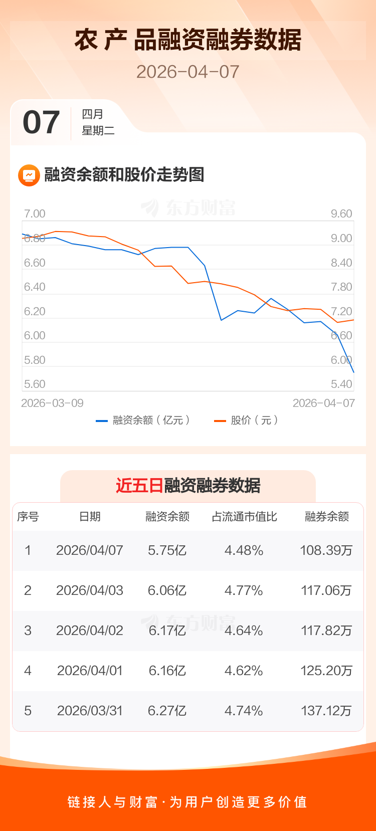 交易所最新数据显示,农 产 品于2026年4月7日获融资买入1832.42万元,融资偿还4978.97万元,当日融资净偿还3146.56万元。目前,该股融资余额5.75亿,占流通市值比例为4.48%。