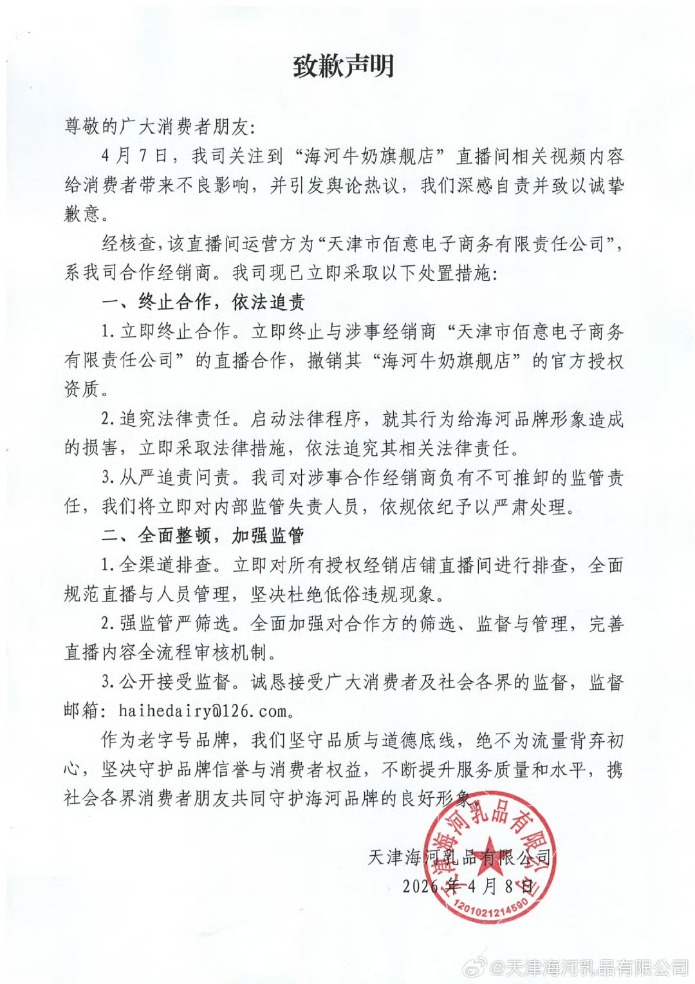 针对旗下授权直播间出现的低俗违规内容,天津海河乳品有限公司(简称“海河乳品”)于4月8日在官方微博发布正式致歉声明,就事件给消费者造成的不良影响深表自责,并公布系列处置与整改措施。