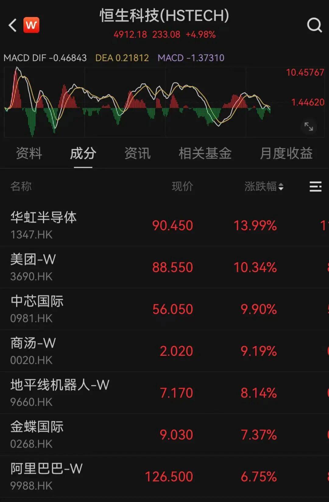 港股同样走强,截至发稿,恒生指数涨2.76%,恒生科技指数涨4.98%,恒生中国企业指数涨2.58%。华虹半导体、美团涨超10%,中芯国际、商汤涨超9%。