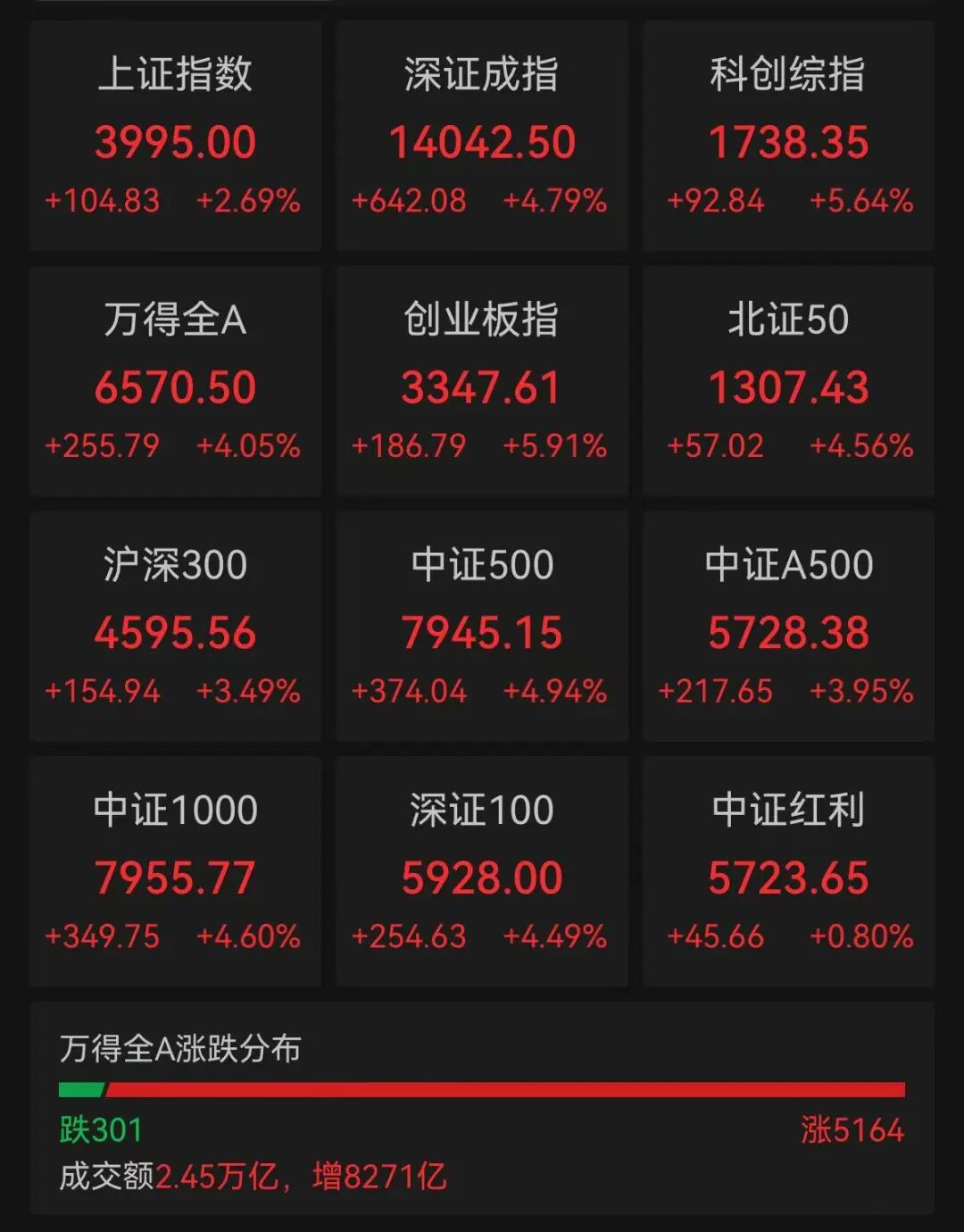 A股强势反弹,截至收盘,上证指数收涨2.69%,逼近4000点,创业板指大涨5.91%,深证成指涨4.79%,科创综指涨5.64%。全市场超5100只个股飘红。
