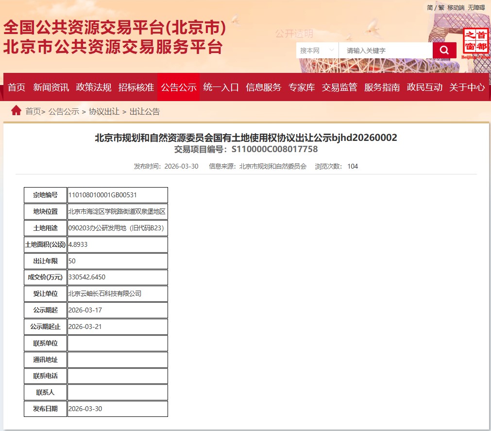 北京市公共资源交易服务平台披露的土地协议出让信息显示,3月30日,字节跳动全资控股的北京云岫长石科技有限公司以约33.05亿元总价,获得海淀区学院路街道双泉堡地块。