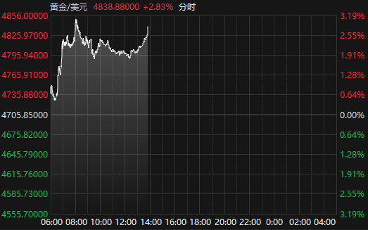 上证报中国证券网讯据Choice数据,4月8日午后,国际现货白银涨幅扩大至6%,截至13:51报77.37美元/盎司,日内涨6.01%;现货黄金报4838.88美元/盎司,日内涨2.83%。