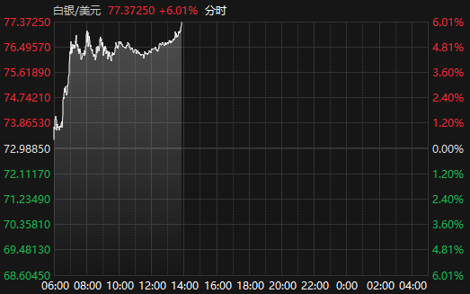 国际现货白银涨幅扩大至6%
