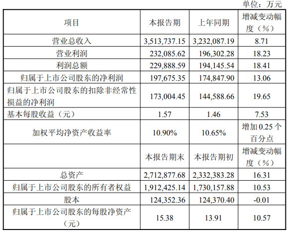 根据2025年度业绩快报,明泰铝业全年实现营业总收入351.37亿元,同比增长8.71%;归属于上市公司股东的净利润19.77亿元,同比增长13.06%;基本每股收益1.57元。