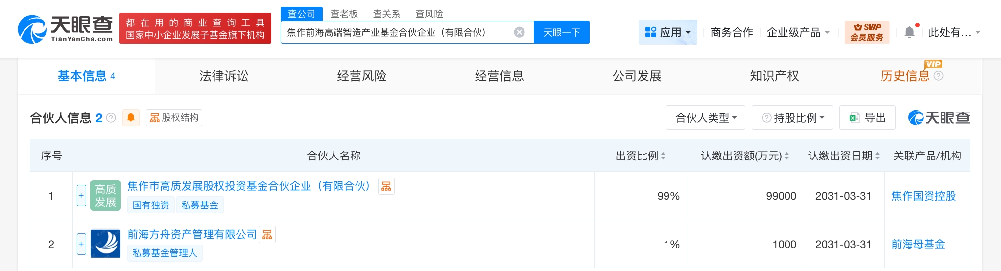 每经AI快讯,天眼查工商信息显示,近日,焦作前海高端智造产业基金合伙企业(有限合伙)成立,执行事务合伙人为前海方舟资产管理有限公司,出资额10亿元人民币,经营范围包括以私募基金从事股权投资、投资管理、资产管理等活动,创业投资。合伙人信息显示,该基金由焦作市高质发展股权投资基金合伙企业(有限合伙)、前海方舟资产管理有限公司共同出资。