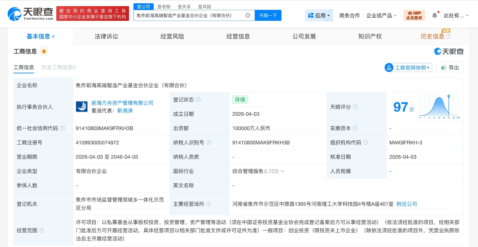 南方财经4月9日电,天眼查工商信息显示,近日,焦作前海高端智造产业基金合伙企业(有限合伙)成立,执行事务合伙人为前海方舟资产管理有限公司,出资额10亿人民币,经营范围包括以私募基金从事股权投资、投资管理、资产管理等活动,创业投资。合伙人信息显示,该基金由焦作市高质发展股权投资基金合伙企业(有限合伙)、前海方舟资产管理有限公司共同出资。