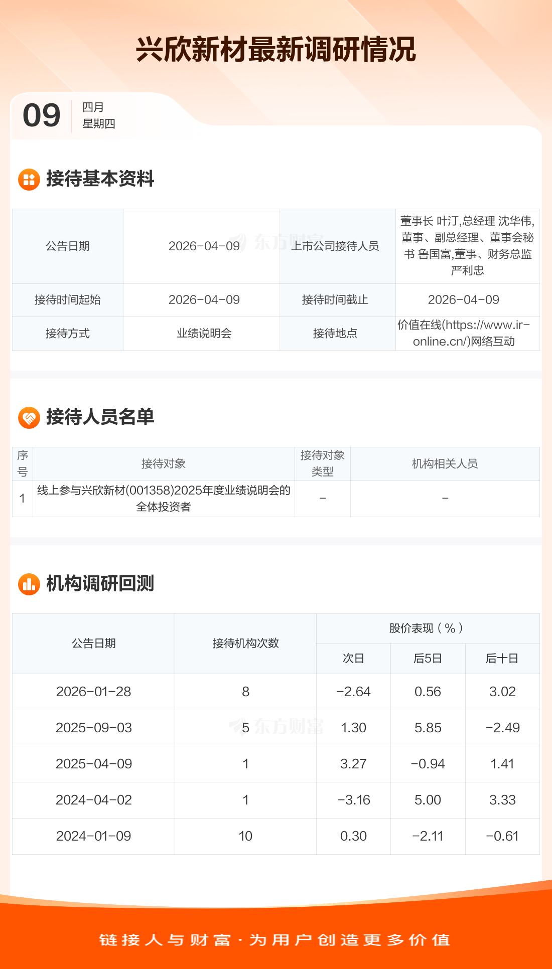 兴欣新材4月9日公告称,4月9日接待线上参与兴欣新材(001358)2025年度业绩说明会的全体投资者等1家机构调研。接待人员包括董事长 叶汀,总经理 沈华伟,董事、副总经理、董事会秘书 鲁国富,董事、财务总监 严利忠。