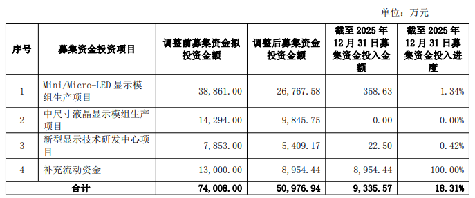 截至2025年12月31日的募集资金投入进度显示,补充流动资金进度为100%,“Mini/Micro-LED显示模组生产项目”、“中尺寸液晶显示模组生产项目”及“新型显示技术研发中心项目”进度分别为1.34%、0.00%、0.42%。