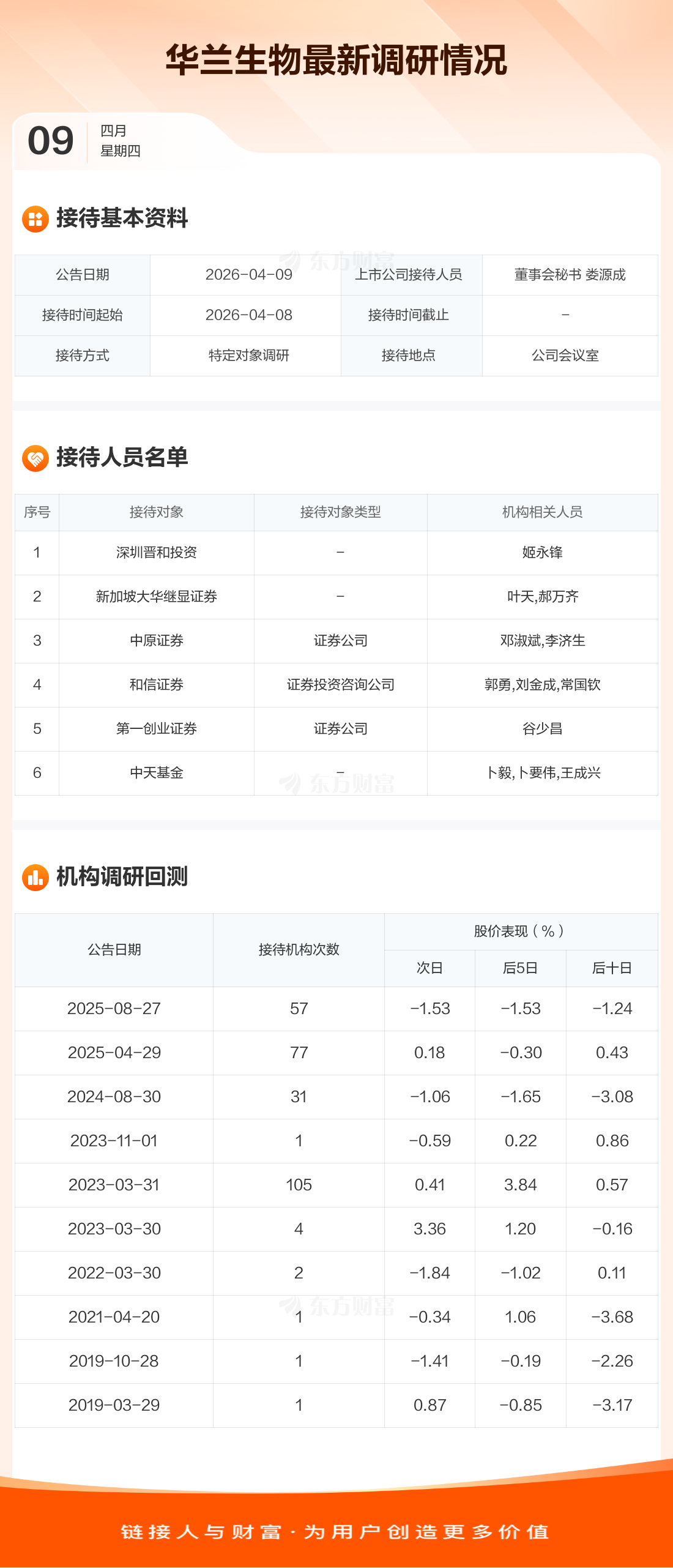 华兰生物4月9日公告称,4月8日接待深圳晋和投资等6家机构调研。接待人员包括董事会秘书 娄源成。