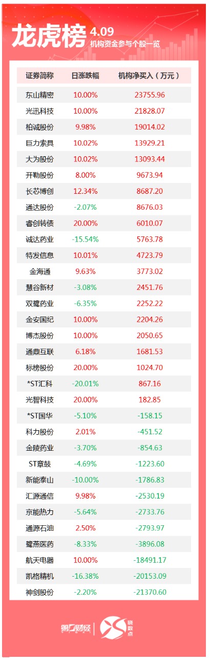 龙虎榜丨机构今日买入这20股,卖出神剑股份2.14亿元