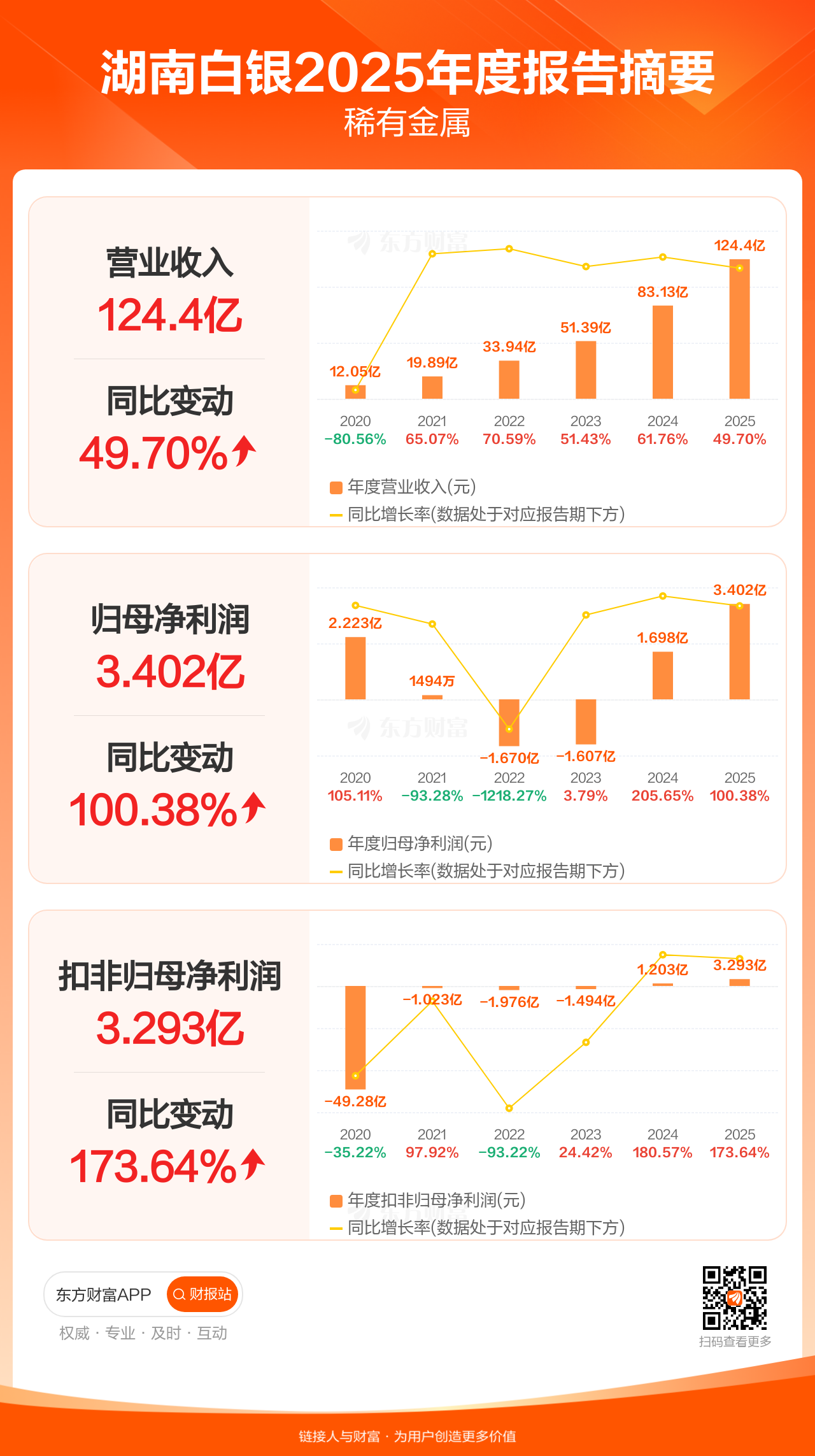 湖南白银4月10日发布2025年年报显示,公司全年实现营业收入124.45亿元,同比增长49.70%;归母净利润3.40亿元,同比增长100.38%;扣非归母净利润3.29亿元,同比增长173.64%。